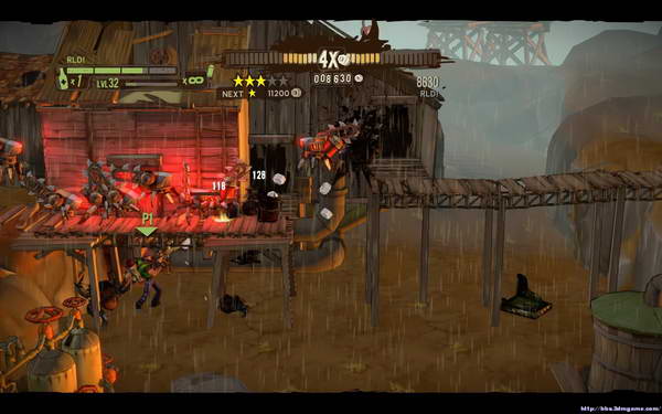 到了桥上会到第四个遇敌点会出现两个榴弹机器人和一定数量的飞行机器人等全数击杀后从矿车跳到上方继续前进.解决掉路上的自走炮台和飞行机器人后来到森林入口会到第五个遇敌点会出现一定数量的飞行机器人和两个榴弹机器人等,前进一段距离后会到第六个遇敌点会出现一个自走机枪和飞行机器人等杂兵.边走边清理杂兵到下个补给点后前方就是BOSS战