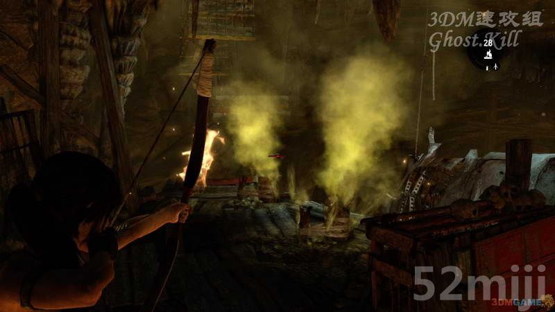 从这个房间出比较简单,还是说一下,打开瓦斯房门,然后用弓箭把上边裹着绳子的铁笼拉过来,然后用火箭射瓦斯即可,爆炸后山洞崩塌,逃离后来到上层。