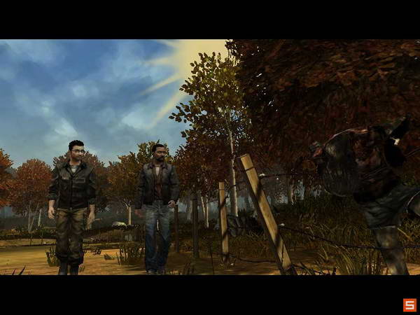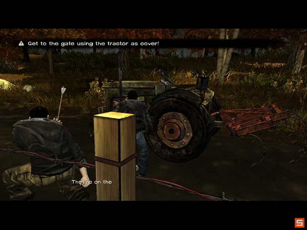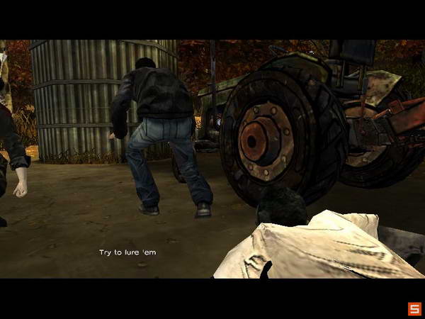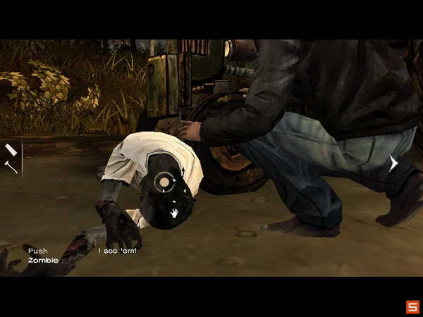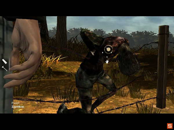 第一个僵尸是膝盖上,哦不,头部中了一箭,你可以把箭收起来,不知道有啥用,然后把他推倒。。。。(呃?推倒?)