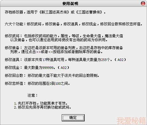 1. 修改武将的属性,等级,装备,以及是否出场。如果你玩《新三国志英杰传》,那个叫什么魏延的怎么都不出来,就用这个修改器强制魏延出场吧。另外一些奇妙的效果也可以用它尝试一下:比如强行装备青龙偃月和穿云箭给一个很牛的武将,然后让它往敌人堆里一站,即使你不主动攻击,一个回合之后,光反击下来就足以让世界清净了。