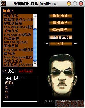 [飞行训练场] X=427.3448 Y=2530.11 Z=16.63916 [降落伞1] X=-773.4539 Y=2422.24 Z=157.0933 [赛艇训练场] X=-2185.718 Y=2414.018 Z=5.15625 [赛车训练场] X=-2027.265 Y=-98.79913 Z=35.16406 [汽车训练场] X=-2027.265 Y=-98.79913 Z=35.16406 [卡车任务] X=-85.26679 Y=-1124.623 Z=1.078125 [初始存盘点(CJ's home)] X=2494.733 Y=-1685.342 Z=13.51175 [摩托训练场] X=1168.464 Y=1368.405 Z=10.81251 [LAS VENTURAS机场] X=1701.069 Y=1614.135 Z=10.46784 [工地任务] X=826.6583 Y=846.4678 Z=11.41931 [LOS SANTOS机场] X=1726.392 Y=-2558.555 Z=13.54688 [SA最高楼] X=1530.45 Y=-1358.184 Z=329.4609 [BUFFALO(CAR)] X=888.3005 Y=-25.53324 Z=63.22531 [军事基地] X=324.1367 Y=1972.594 Z=17.64063 [LOS SANTOS健身房] X=2228.53 Y=-1725.542 Z=13.55384 [隐藏地点1] X=1412.64 Y=-1.78751 Z=1000.924 [赌马场] X=1290.733 Y=267.5315 Z=19.55469 [Four Dragons任务点] X=2026.168 Y=1007.049 Z=10.82031 [方块任务点] X=2192.682 Y=1675.337 Z=12.36719 [G任务点(LAS VENTURAS)] X=1593.769 Y=2668.554 Z=10.82031 [自由之城(隐藏地点)] X=-790.9006 Y=506.3619 Z=1371.749 [Libery City1] X=-791.2449 Y=504.9975 Z=1367.367 [自由之城] X=-802.3701 Y=503.1339 Z=1360.535 [自由之城2] X=-844.2181 Y=514.418 Z=1359.433 [自由之城3] X=-854.0249 Y=515.0472 Z=1359.246 [隐藏地点2] X=1395.658 Y=-18.00872 Z=1000.909