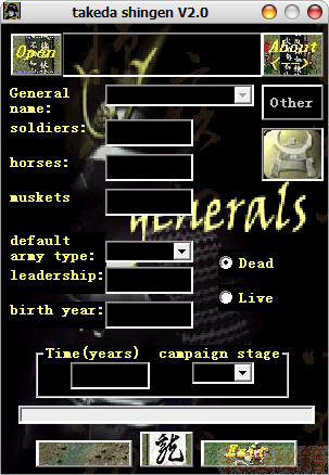 主界面:先点左上角的“Open”打开一存档,再点右上角的“About”打开扩展界面;在General name中选人物,看头像应该会知道是谁,soldiers是步兵,包括刀、枪、弓,horses是骑兵,muskets是铁炮;default army type是默认带的兵种0是刀,1是骑,2是弓,3是枪,4是铁炮;leadership是统率,最大99;birth year为出生年(可以把逃跑双山改为很晚出生,真田一族改早点出生);Time(year)和campaign stage我不清楚用途;Carry Out是保存修改(每改一人点一次);Bio graph是人物简介(英文的)。