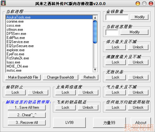 由于是用VB编写的,需要VB运行库的支持。你可以在本站或其他地方下载"msvbvm60.dll"。请先运行游戏再运行修改器。如果是第一次运行修改器请先点击"Make BaseAddr File"会在当前目录下生成一个BaseAddr.DAT的文件(误删或丢失的话就重新生成一个)。然后在"当前进程"窗口里找到ASFPC.EXE并选择之,当进入游戏读取存档或新开始后点击Refresh键刷新就可以做各种修改了。正常情况下你可以在"金钱数量"窗口里看到你当前的金钱数量,这表示修改器运行正常。如果显示不出或数字不对时表示在你的系统环境下内存地址有偏移,解决的方法请看"疑难解答.TXT"。