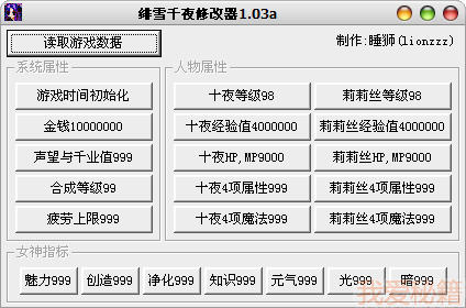由于游戏数据加过密,本人能力又有限,所以修改器功能比较约束,高手不要鄙视我哦~