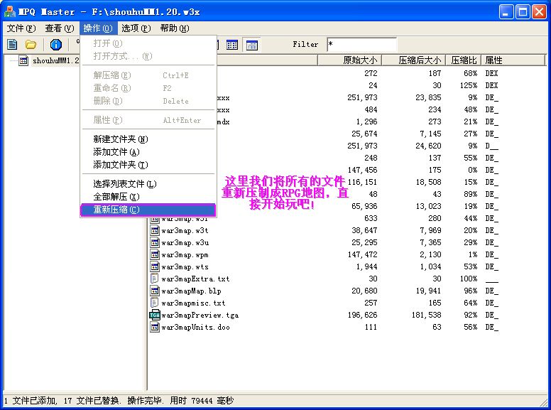 最后,我们来打包,选“操作”——“重新压缩”(这项操作直接在原地图上进行,如果您还想保留原来地图,请提前做好备份),之后,我们直接运行地图游戏,真爽快。