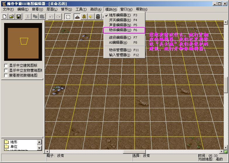 接着打开地图编辑器,选择“模块”菜单,不同编辑器对应着游戏的不同设置参数,我们要修改的主城属性属于“物体编辑器”管的范畴(英雄速度、魔法、攻击力、农民维修速度,敌人单位的属性都可以在这里修改),打开“物体编辑器”。