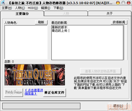 这东西不用我多说了吧,玩过TQIT的朋友都应该知道,这应该是TQIT这游戏最强悍的一个修改器,几乎所有的东西都能够修改到,打开的时候会比较慢,多等一下,这是程序在找更新,打开后在菜单栏里点“主要→设置”,在“常规”页里的“杂项”里,把“关闭新闻与版本更新检查”的复选框点上,在下次启动时就不会慢了,程序打开后会自动读取你的游戏人物存档,存档名称会出现在“主要部分”的“人物角色”栏里,点击要修改的存档就可以进入到人物修改页面对其进行修改了,这是最新3.3.5版,在网上找了半天也没有找到汉化版的,所以就自己动手了,不到位的地方请各位谅解~~