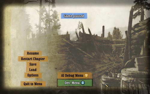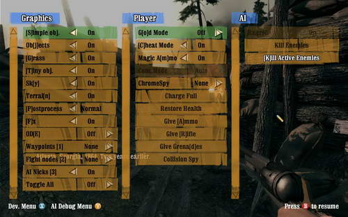 官方作弊使用:进入游戏,读取关卡,按ESC打开菜单,选择"dev menu"。