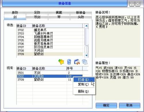 3.支持任意添加和删除装备,并且可以100%打造自己的装备(所有装备,包括名称,说明,属性,注灵等),支持将自己打造的装备导出和导入