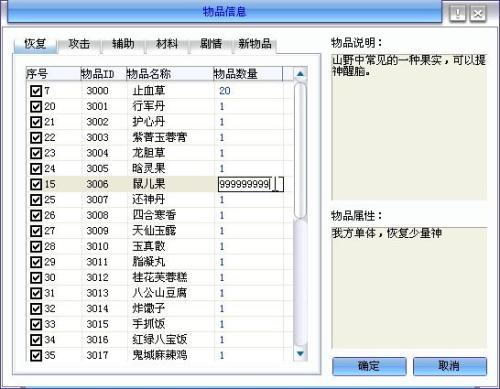 游戏中物品的数量最大是99个,所以使用本存档编辑器修改的物品数量若超过99个,则在游戏中获得一个新的物品,该物品的个数会被置为99个,所以建议大家若使用修改器修改了物品个数,最好不要再去拾游戏中的物品了 :P
