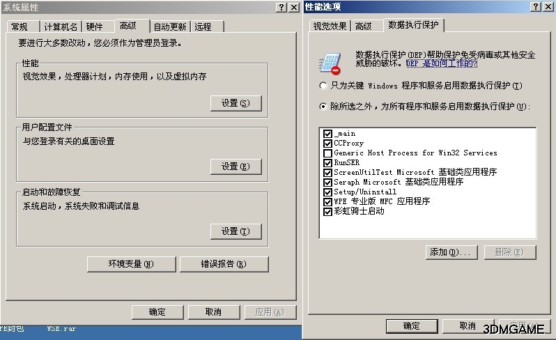 在我的电脑——属性——高级——性能设置——数据执行保护——添加修改器