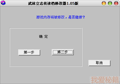 修改的太过分,读取游戏时出现“No cheat for REAL KongFu Master,不能读档的情况处理,先打开修改器,再运行游戏,待游戏菜单界面切出,点修改器的第一步,此时先别关修改器,切回武林立志传后发现已能运行存档,逃过作弊检查,为了对源程序进行保护,待档读完后再切出,点第二步以恢复内存,点完之后,再关修改器。注意按照程序步骤做。已试过,1.05版有效。可能对1.06版无效,因我没有升级1.06版,没试过。