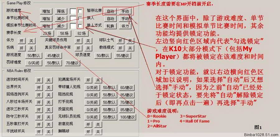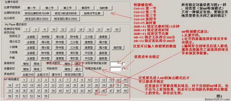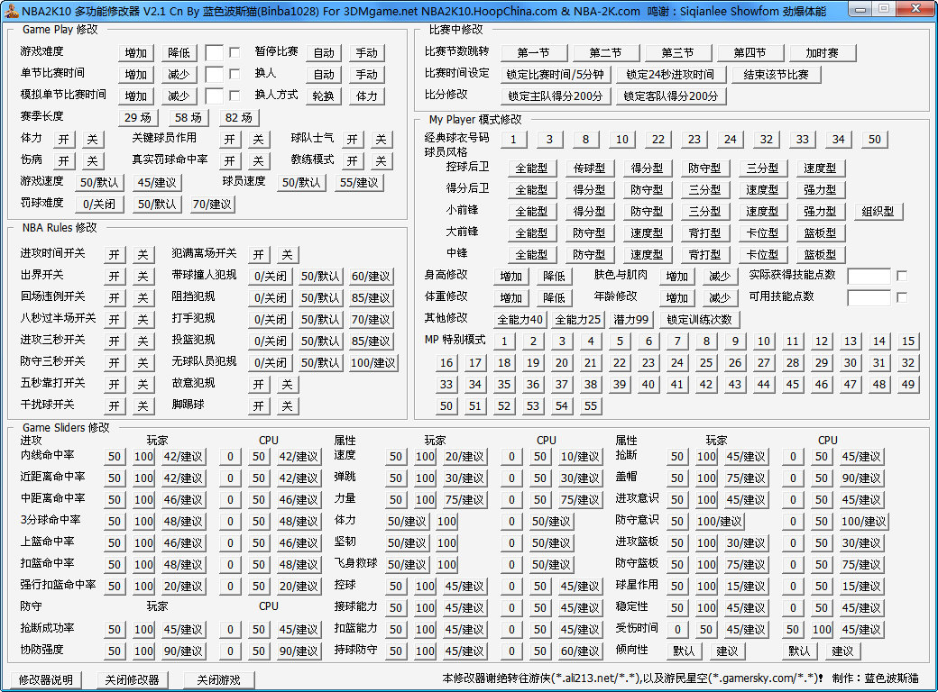 (7)功能有很多,这里不一一列举使用方法了,工具已经给大家了就请自行尝试,有些修改功能可能需要在比赛前就开启(比如换人、教练模式),有些需要从开新档(比如赛季长度),有些需要修改后保存,有些不会立刻看到效果(比如肤色与肌肉,如果你已经使用NBA球员进行MP模式,这项修改是无效的)。