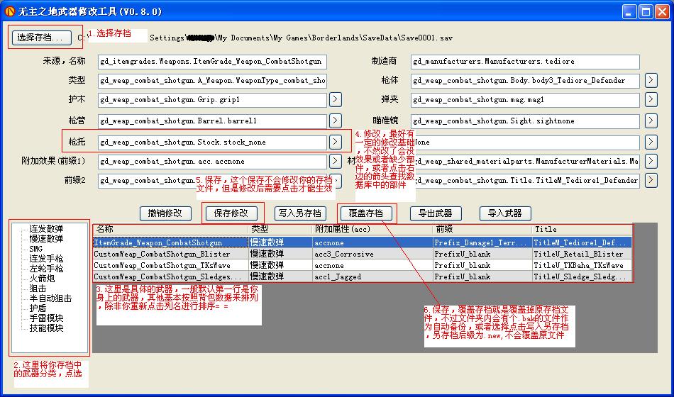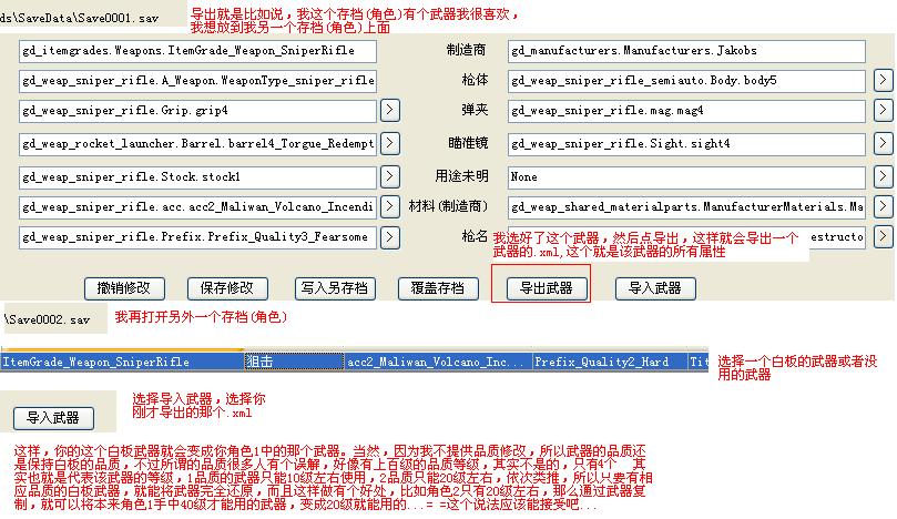 2.本程序功能还不完全,比如枪械部件查询;护盾,手雷,技能mod的修改;名称前缀组合;枪支导入和导出等等功能。所以希望朋友们多提建议