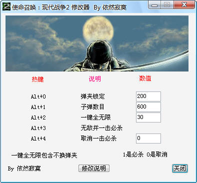 修改器已经完全整合, 很多东西界面已经隐藏,开启前两项可以实现无限子弹,无限弹夹,无限闪光,无限手雷,无限烟雾弹,无限震撼弹,不换弹夹等功能,第三项就是无敌模式和一击必杀了,至于第四项即是取消一击必杀.