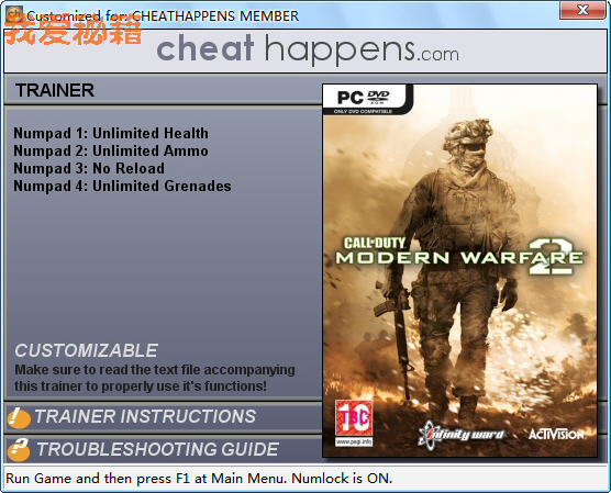 2、主菜单按 [F1] 激活修改器,激活成功会有 Activated 声音提示