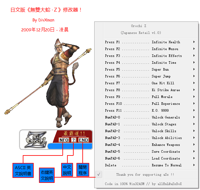 或许中文版没时间玩了,一如既往支持“无双系列”写个修改器罢了。希望我的 idea 有人能明白。简单在 32bit XP 和 64bit WIN7 测试了下,貌似没啥问题。如果有 bug 请汇报,我周末上来看看。谢谢!