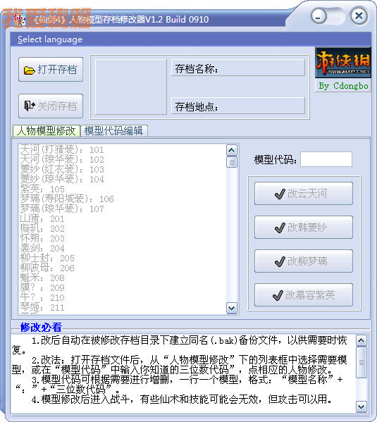 2、改法:打开存档文件后,从“人物模型修改”下的列表框中选择需要模型,或在“模型代码”中输入你知道的三位数代码”,点相应的人物修改。