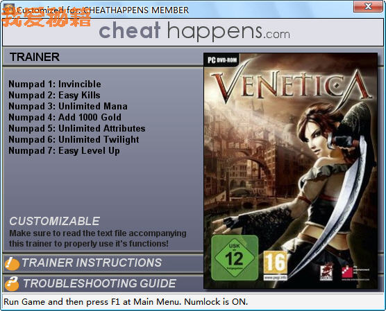 2、主菜单按 [F1] 激活修改器,激活成功会有 Activated 声音提示。