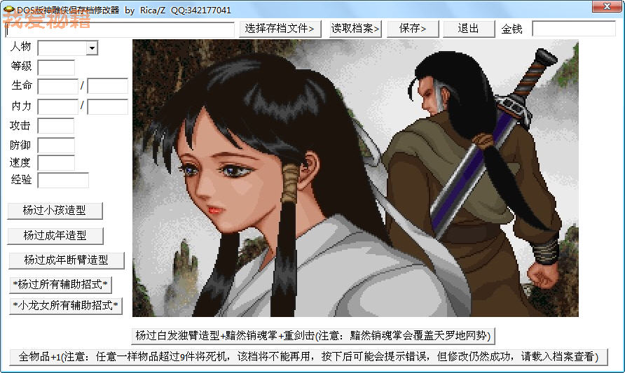 4.最后修改完就是按“保存”然后按“退出”了,由于修改器是我第一次做修改器做得,可能会有许多小 bug,但如果不是超级大BUG的话,我就不打算再改了,所以大家用的时候希望尽量先备份存档,然后再 修改,还有大家不要将属性和金钱调得【人神共愤】咯~~不然会内存溢出D~~~为了游戏的平衡性,希望 大家不要修改人物属性,只修改物品和金钱就好了,至于招数,看你自己了~~“重剑击”要装备“玄铁 重剑”才能用哦~~~NND~~这招太狠了~~最后的BOSS绝对一招被秒~~囧~~~~还有的是,那个“冰糖葫芦” 其实是武器来的~~~囧~~~~不过装了之后竟然所有招数都能用了~~不用分什么棍丫~~掌丫~~剑丫~~~