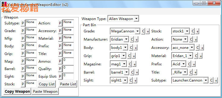 武器修改器”Val.Borderlands.WeaponEditor.exe”右边的”weapon type”是你要修改武器类型, partbin就是武器的特性,如何使用? 例: 若修改狙击选”weapon type”入面 “sniper rifle” (狙击).. 再选partbin入面既特性如body (即枪身) 既body1 再按右边的加号, 跟著左边”weapon”的 “body:”会出现”gd_weap_sniper_rifle.Body.body1” (这个就你要的特性) 然后把它複製