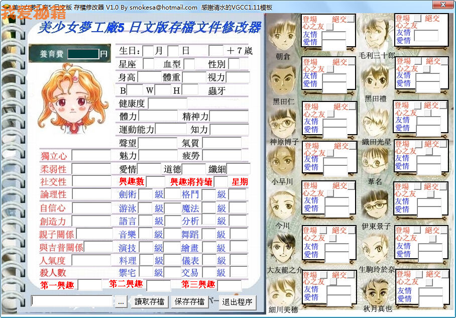 注意:点击登场按钮,绝交按钮,心之友按钮,会出现错误警告:list index out of bounds(1),这是VGCC的程序问题,不用管它,实际上操作已经完成,关掉它可以继续修改其它的,不影响。