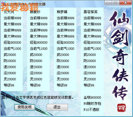 修改器适用仙剑4简体中文版V1.0和V1.1,其它版本是否适用:未知。