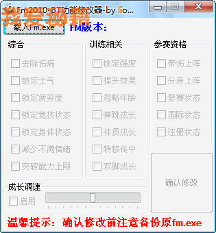 2) 将修改器放到游戏目录运行,载入fm.exe,勾选要修改的内容,确认修改