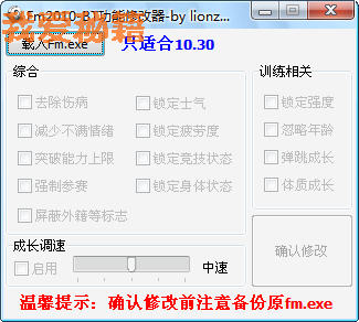 2) 将修改器放到游戏目录运行,载入fm.exe,勾选要修改的内容,确认修改