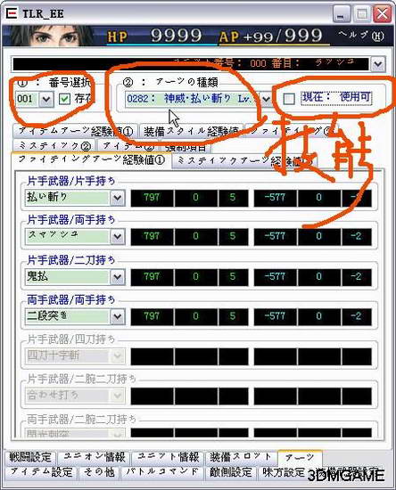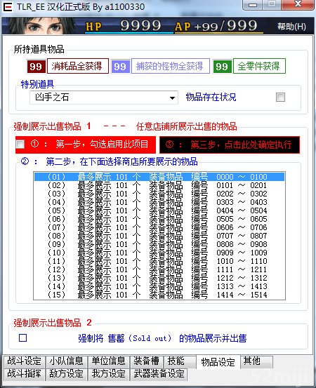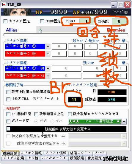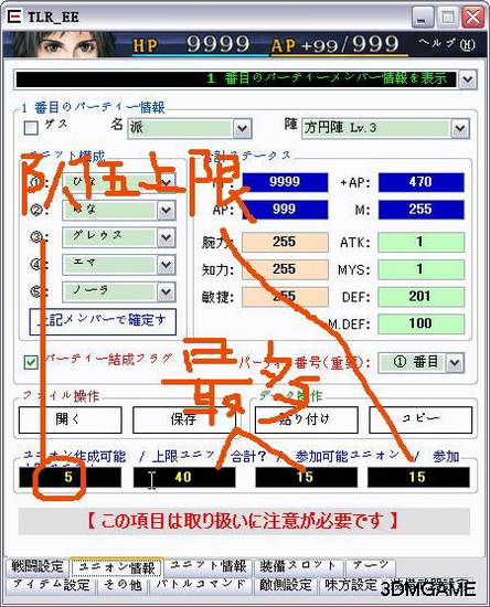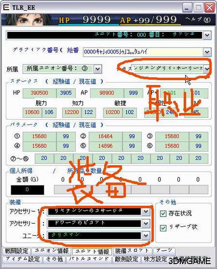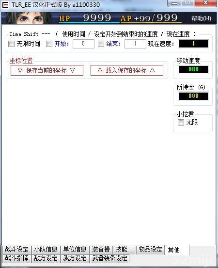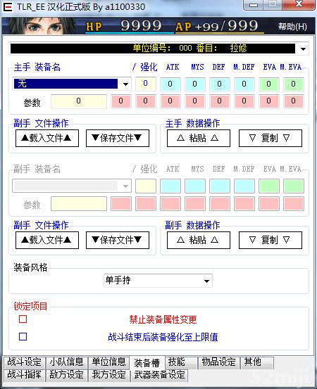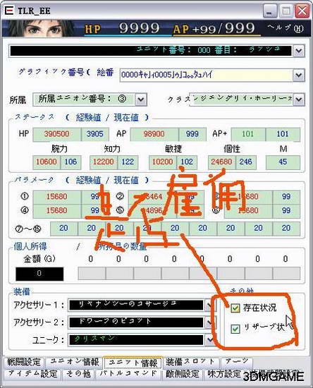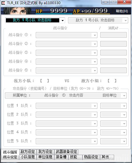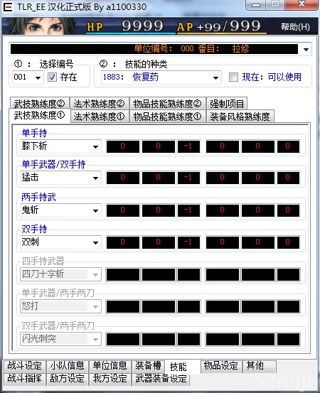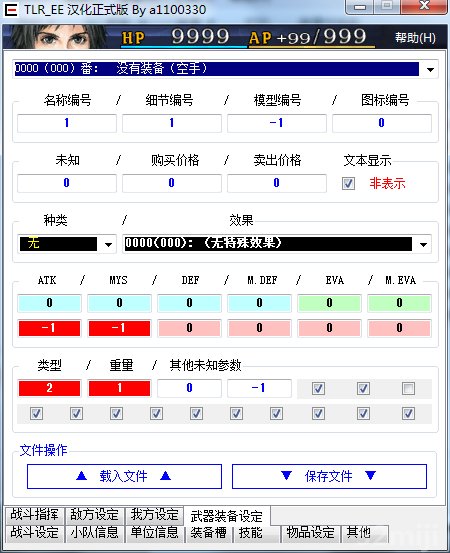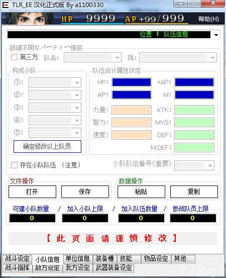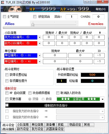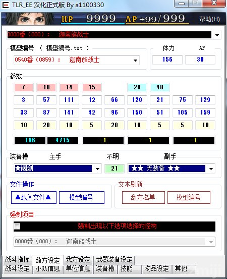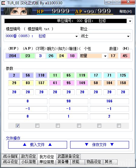 2、"单位信息"页面部分人物对不上模型编号数据,是原版已有的BUG,而游戏数据并不是共用的,例如乔多在"单位信息"数据是237,而在"我方设定"的数据里则是39,"单位信息"和"我方设定"指向的都不是同一个地址和同一数值所致