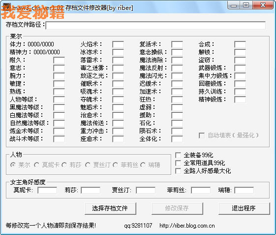 状态: --------------- 体力(精神)值: 估计与等级和耐久有关: 体(精神)=4*chara_level+耐久(意志)*8 --------------- --------------- option_offset:0004H chara_offset:00e2H(226) --------------- 人物id:莱尔:00c0H,莫妮卡:01a2H (1:莱尔;2:莫妮卡;3:莉莎;4:贾丝汀;5:菲莉丝;6:瑞穂;) 体力当前:莱尔:00c4H,莫妮卡:01a6H 精神当前:莱尔:00c8H 体力max:莱尔:00ccH 精神max:莱尔:00d0H 耐久:莱尔:00d4H 意志:莱尔:00d8H 腕力:莱尔:00dcH 敏捷:莱尔:00e0H 熟练:莱尔:00e4H chara_level:莱尔:00e8H 黑魔法_level:莱尔:00ecH 白魔法_level:莱尔:00f0H 自然魔法_level:莱尔:00f4H 炼金术_level:莱尔:00f8H 战斗术_level:莱尔:00fcH chara_exp:莱尔:0100H 黑魔法_exp:莱尔:0104H 白魔法_exp:莱尔:0108H 自然魔法_exp:莱尔:010cH 炼金术_exp:莱尔:0110H 战斗术_exp:莱尔:0114H --------------- option_offset:0002H --------------- (34项) 火焰术_level:莱尔:014eH 冰冻术 落雷术 毒之迷雾 放逐之光 催眠术 吸魂术 夺魄术 魅惑术 治愈术 魔法传送 重力冲击 痊愈术 复活术 意念操纵 魔法消除 魔法反射 魔法闪光 迟缓术 加速术 狂热 虚弱 援助 石化 陨石术 全体化 合成 解锁 盗窃 武器锻炼 集中力锻炼 回避锻炼 持久训练 精神锻炼_level:莱尔:0190H 物品及道具:(直接改相应点数据) --------------- option_offset:0002H --------------- (13) 短剑:060eH 罗马短剑:0610H 卡多拉斯长剑:0612H 宽刃剑:0614H 长剑:0616H 西洋剑:0618H 弯刃剑:061aH 圆月弯刀:061cH 军刀:061eH 必中之剑:0620H 光之剑:0622H 格姆之剑:0624H 神剑巴尔姆克:0626H (2) 解答者之剑:062aH 光之烙印:062cH (10) 双手长剑:0636H 双手大剑:0638H 苏格兰双手剑:063aH 火焰之剑:063cH 巨剑:063eH 斩马刀:0640H 冰之烙印:0642H 复仇者之剑:0644H 神剑富路丁:0646H 亚瑟王圣剑:0648H (11) 短刀:065eH 刀:0660H 小太刀:0662H 太刀:0664H 孙六:0666H 长光:0668H 正宗:066aH 虎彻:066cH 村雨:066eH 火燕:0670H 虚无:0672H (6) 忍者刀:0678H 柳生:067aH 菊一文字:067cH 武藏:067eH 鳄颚:0680H 侵蚀:0682H (8) 皮革手套:0686H 钢手套:0688H 青铜指关节:068aH 黄铜指关节:068cH 铁拳:068eH 巴格纳格:0690H 力量手套:0692H 比库若:0694H (1) 斗魂手套:0698H (13) 肃穆:06aeH 边缘:06b0H 战斧:06b2H 新月战斧:06b4H 蝎斧:06b6H 巴迪须:06b8H 战戟:06baH 皮尼卡:06bcH 布琉那库:06beH 盖.博尔格:06c0H 冈尼尔:06c2H 死神镰刀:06c4H 魔法手:06c6H (10) 木棒:06d6H 狼牙棒:06d8H 锤子:06daH 战槌:06dcH 流星锤:06deH 大铁锤:06e0H 哈利桑:06e2H 神槌:06e4H 平底锅:06e6H PIKOPIKO铁槌:06e8H (8) 短弓:06feH 长弓:0700H 猎弓:0702H 巨弓:0704H 桑伽:0706H 米斯特拉特:0708H 和弓:070aH 丘比特之箭:070cH (4) 轻十字弩:0726H 重十字弩:0728H 速射弩:072aH 劲弩:072cH (6) 手枪:073aH 野牛枪:073cH 麦林枪:073eH 塔斯兰枪:0740H 散弹枪:0742H 激光枪:0744H (5) 手杖:074eH 魔杖:0750H 雕刻手杖:0752H 苍蝇拍子:0754H 波浪鼓:0756H (8) 双手杖:0762H 魔法杖:0764H 魔法师之杖:0766H 橡树杖:0768H 神使之杖:076aH 利维坦:076cH 捉虫网:076eH 立式麦克风:0770H (12) 飞镖:0776H 小刀:0778H 投石器:077aH 匕首:077cH 暗剑:077eH 手里剑:0780H 环轮:0782H 战斧:0784H 来回镖:0786H 塔斯兰魔弹:0788H 菜刀:078aH 铁棍:078cH (10) 外袍:079eH 布衣:07a0H 软革铠:07a2H 硬革铠:07a4H 金属胸板甲:07a6H 锁环甲:07a8H 连锁甲:07aaH 鳞甲:07acH 锁子甲:07aeH 板甲:07b0H (8) 凉鞋:07c6H 皮鞋:07c8H 普通靴子:07caH 长筒靴:07ccH 钉鞋:07ceH 护胫:07d0H 短靴:07d2H 篮球鞋:07d4H (14) 围巾:07eeH 短项链:07f0H 胸针:07f2H 垂饰:07f4H 蓝色项链:07f6H 头环:07f8H 勾玉:07faH 红色项链:07fcH 绿色项链:07feH 黄色项链:0800H 橙色项链:0802H 白色项链:0804H 黑色项链:0806H 紫色项链:0808H (18) 苹果:09f6H 香蕉:09f8H 橙子:09faH 葡萄:09fcH 柠檬:09feH 草莓:0a00H 胡萝卜:0a02H 牛奶:0a04H 芹菜:0a06H 梅:0a08H 酒:0a0aH 砂糖:0a0cH 盐:0a0eH 鸡蛋:0a10H 蜂蜜:0a12H 南瓜:0a14H 西红柿:0a16H 胡椒:0a18H (4) 红曼陀罗叶子:0a5aH 蓝曼陀罗果实:0a5cH 黄曼陀罗汁液:0a5eH 青曼陀罗种子:0a60H (21) 苹果汁:0abeH 香蕉圣旦:0ac0H 橙汁:0ac2H 葡萄汁:0ac4h 蔬果汁:0ac6H 西红柿汁:0ac8H 葡萄酒:0acaH 梅酒:0accH 梅干:0aceH 鲜奶油:0ad0H 草莓蛋糕:0ad2H 冰激凌:0ad4H 水果冰激凌:0ad6H 烤饼:0ad8H 苹果派:0adaH 南瓜派:0adcH 布丁:0adeH 南瓜布丁:0ae0H 新式布丁:0ae2H 新式南瓜布丁:0ae4H 奶油派:0ae6H (8) 体力药剂(小):0b86H 体力药剂(大):0b88H 精神力药剂(小):0b8aH 精神力药剂(大):0b8cH 治疗药剂(小):0b8eH 治疗药剂(大):0b90H 万能药(小):0b92H 万能药(大):0b94H 好感度: 女友: ----------- chara_offset:008cH(140) ----------- 莫妮卡:2180H 莉莎:220cH 贾丝汀:2298H 菲莉丝:2324H 瑞穂:23b0H 教师:(该科等级高则教师也心情激动,不须另改) 其他学生: ----------- chara_offset:008cH(140) ----------- (30位) 依丽娜:2784H 埃丝特:2810H 克拉拉:289cH . . . 尼娜:36d4H 帕特茜:3760H 课题: ----------- option_offset:0004H chara_offset:008cH(140) ----------- 接受之课题: 莱尔:2100H 莫妮卡:218cH -------------- 课题代码:(包括动作代码和目标代码且容易造成崩溃,老子不解析咯) 00H:null 01H:... --------------