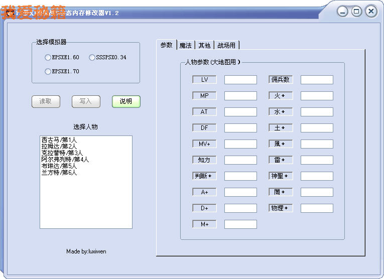 2.修改器更新1.2版,支持EPSXE1.60、SSSPSX0.34和EPSXE1.70三种版本的模拟器,对于其他种类和版本的模拟器不支持.