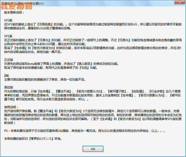 至于SP1跟SP2版,则在原有的正式版的基础上稍作调整和功能追加,详细请参考那啥使用说明界面。。基本上除非F社就现有的加强版发布新的修正补丁,否则本修改器将不再更新。。。以上。。。