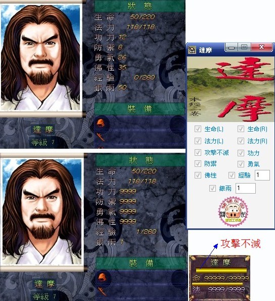 《达摩》修改器的生命(L)(R), 法力(L)(R) ],这四项必须要进入战斗模式下才能修改成功,切记!见谅下!呵呵!