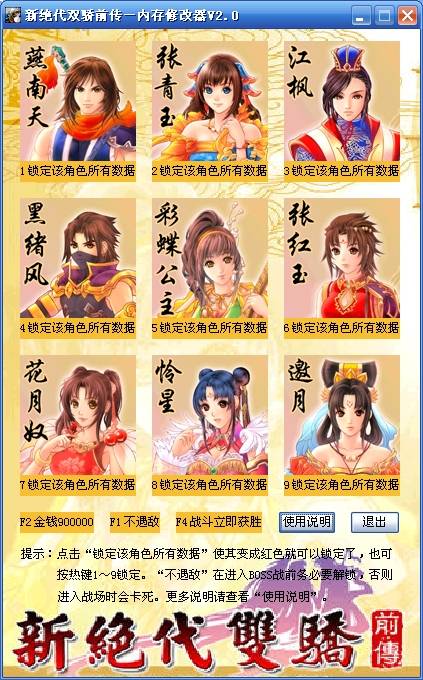 这是本人原创作品,该修改器与1.0版本一样,可修改所有角色的所有人物属性,以及金钱、不遇敌、战斗立即获胜。之所以称为“豪华精简版”是因为界面确实很漂亮,操作很简单,只需点击“锁定该角色所有数据”就能锁定该角色的所有人物属性了,建议大家使用该版本。