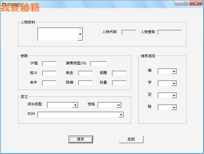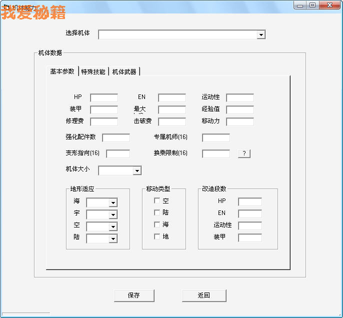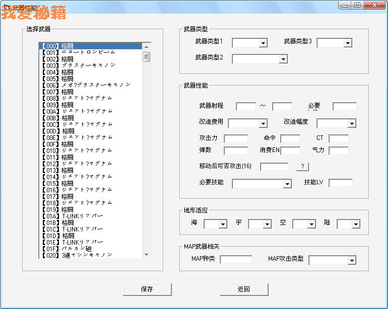 3.按写入后进游戏发现数据没变或不符:请检查修改的ROM与运行游戏的ROM是否一致.如果一致的话多数就是修改器的错误了,出现这种情况的请尽快通知我.还有部分数据(包括机体武器等),要在游戏里重新回到该机体初登场时才能见到效果。