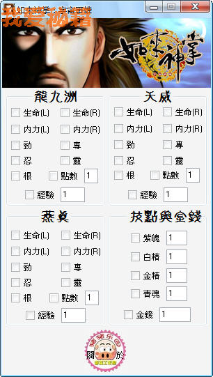 呵呵!本人玩游戏只为了看剧情,不追求什麽的,粗略做了修改器,做得不好,见谅下,需要的ZYM就下载吧!!!