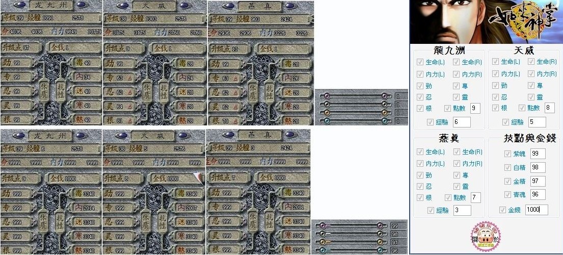 《如来神掌:宇宙争雄》修改器裡三位人物(属性)的全部修改项,必须要进入战斗模式下才能修改成功,而 紫魄,白精,金精,青魂,这四项,如修改用完之后,切换到游戏中任何画面就OK(人物或战门)!