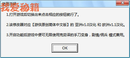 适用环境:Win7/XP 32bit下通过测试,剧情/佣兵模式兼用。