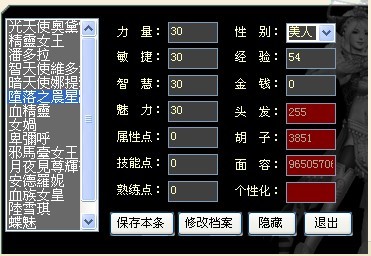 5.何谓变态修改器?当然不光能做出变态的数据来,还可以真正的变态,比如说嬷嬷茶那一天想不开了马上可以变性为雅米拉,可能这个功能华而不实,不过与我暂时放弃和禁用的板块息息相关,比如修改头发、面容、个性化等禁用功能,很可惜,可以让模型导入导出进入一个新的理念,我相信有条件的话我会做出这一块的