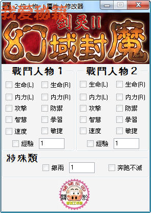 《剑灵2-幻域封魔》修改器的战斗人物1,2的全部修改项,必须要进入战斗模式下才能修改成功(在进行战斗时,用修改器修改是无效的,必须等敌方攻击一次之后才能按修改项,切记!)!而“攻防智学速敏”等项,必须切换游戏选项才行,否则下次战斗时无法表现出来!切记!