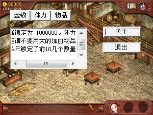 请于进入游戏前打开选项, 金钱锁定为 1000000,体力 锁定请不要用大的加血物品 物品只锁定了前10几个数量