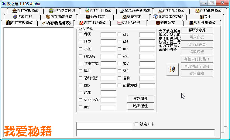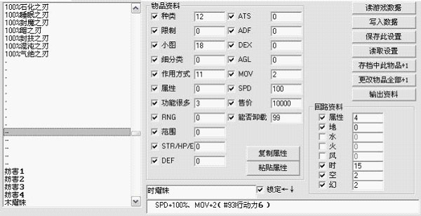 3、内存类修改注意保存设置,下次需要时再导入;写入数据后,请不要再次读取游戏数据,可能会出现乱码,确实须要再次读取,最好重启游戏;修改后的名称和说明的总长度若超过原来的,可能会导致数据溢出。