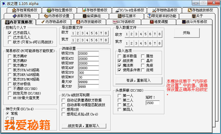 3、 “常规内存修改”,可修改: 控制NPC或敌人、锁CP等、头像屏蔽、战技写轮眼(须配合战斗外形修改) 、神行太保(移动速度加倍)、敌我双方的数据导出与导入(不常用);