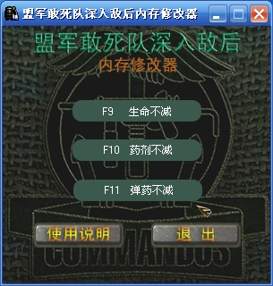 这是内存修改器,有“生命不减”、“药剂不减”、“弹药不减”等3项属性修改,生命不减包括所有人,药剂是指急救包,弹药包括狙击枪子弹和手雷。