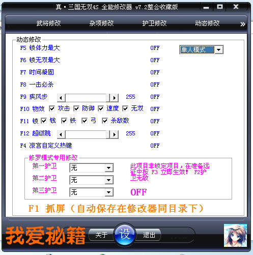 静态即除“动态修改”外的其他各修改项目。使用该类修改应保证不启动游戏的状态下进行,修改完后再进入游戏。需要注意的是,涉及到外型、声音、武功、武器外型的修改是针对游戏文件的,所以必须把修改器放到游戏根目录下(即与Shin Sangokumusou 4 Special.exe同目录)。当修改没有放到该目录下时,这些修改将无效。
