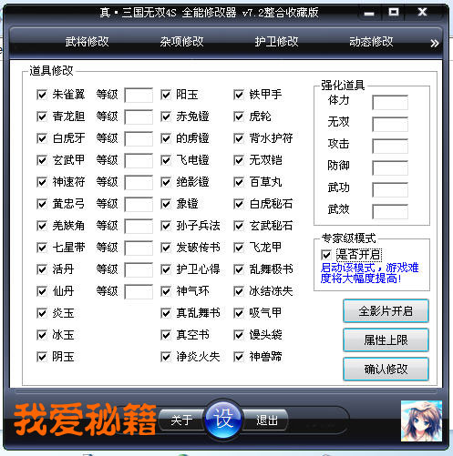 “专家级模式”即将游戏中的小兵全变为无双武将,理论上游戏难度会大幅度提高,需要注意,该功能还不完美,使用后可能导致有些武将的技能出现异常状态,因此可以取消改回来即可。