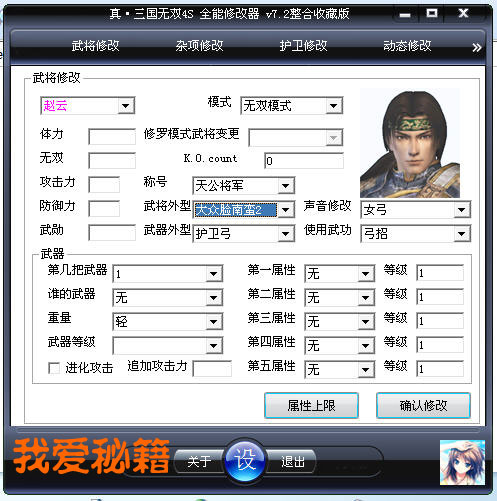 该部分主要针对无双武将进行修改,包括各项能力及外型、声音等,修改时以左上角的下拉列表框内的武将为主,选到谁就改谁(修罗模式除外,因为修罗模式只保存一个人物的记录,所以不能选择改谁,而只能更改任务中的武将)。K.O.count表示武将击杀数,巨剑、碎硬剑、四圣大剑、伏曦大剑表示大剑的4个等级,这时选的等级无效(细剑同)。“属性上限”可以帮助您快速将所有数值修改到游戏标准的数据上限,当然这并不是修改所能达到的上限,因此您也可以手动修改。