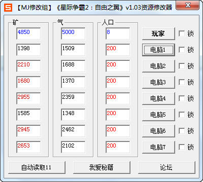 可修改玩家 和 7家电脑的矿、气、和人口。有问题,请跟帖说明。
