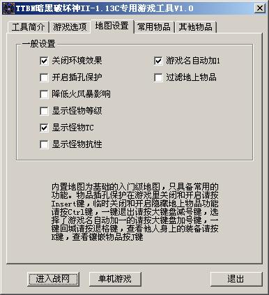 这里有游戏的基本设置,如窗口显示关闭声音和英文界面等,另外就是单机的功能了。这里我们预留了些位置,现在只有个预设6BOSS存档的功能是为单机 6BOSS和单机DC设置的,点这个按钮就会在单机存档里面放一个名为TTBN-SMTPAL的存档上面有6BOSS的一套KEY放在箱子里,另外的8个乔丹之石是用来KDC的只要卖给商人就出DC没有提示,如果再点这个按钮他就会重新覆盖一次这个存档。